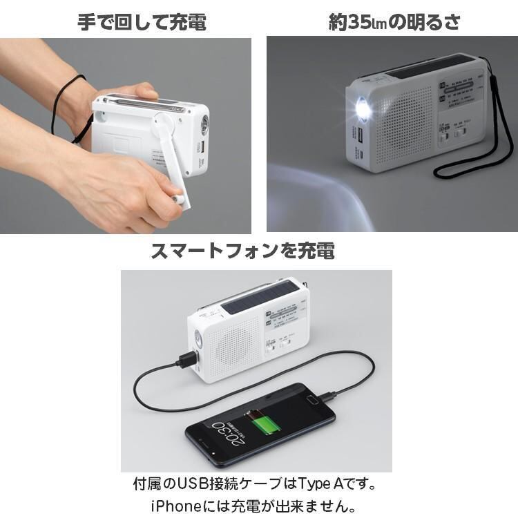 ■使用電池 :単4形乾電池×3本(別売)/※ USB充電・手回し充電・ソーラー充電